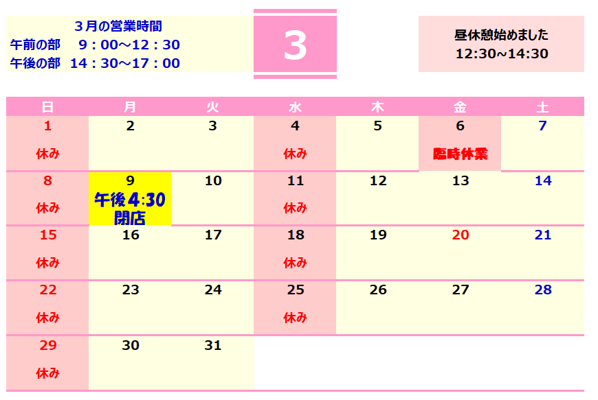 昼休憩中はシャッターを閉めていますので、お預かりやお引き渡しはできませんのでご注意ください。